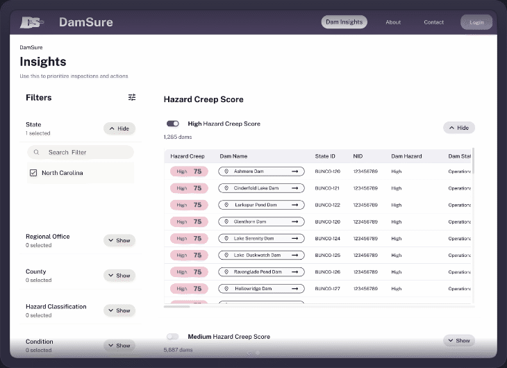 DamSure is a software platform that addresses a critical information gap by automating the assessment of changes to infrastructure, such as buildings and roads that are downstream of dams in the United States, otherwise known as hazard creep. DamSure empowers dam safety offices and dam owners with shared, actionable insights that enable streamlined, data-informed hazard classifications, resulting in safer dams.